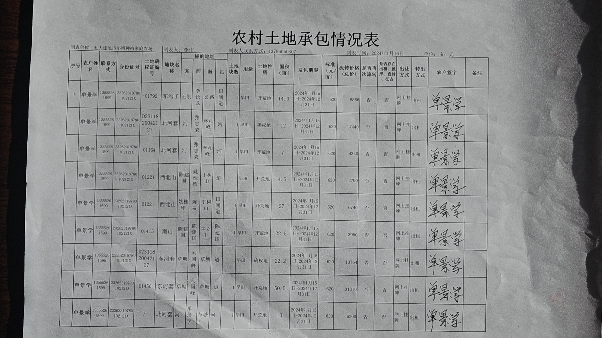 其中确权地84.2亩,机动地0亩,课税地141.5亩,开荒地640.8亩,承包期限为:2024年1月15日---2024年12月31日(详见附表)
