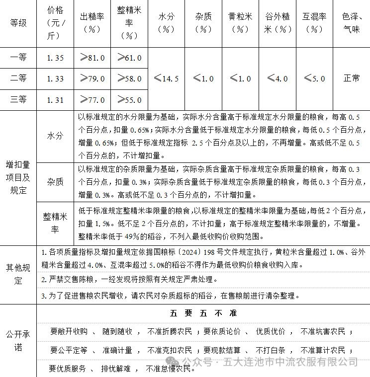根据国家有关部门联合下发的关于印发《小麦和稻谷最低收购价执行预案(2025年版)》的通知和《关于公布2025年稻谷最低收购价格的通知》精神,按照规定价格公开挂牌组织收购最低收购价稻谷,交售的稻谷必须是2025年生产的三等及以上粳稻。粮款支付方式:承贷直属库对售粮者直接统一网银支付。