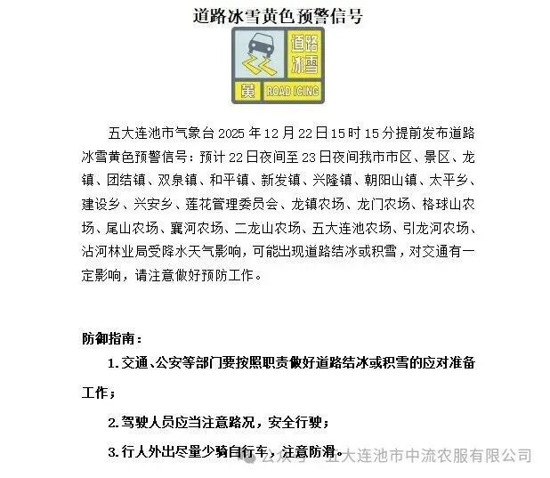 【气象信息】五大连池市气象台发布道路冰雪黄色预警